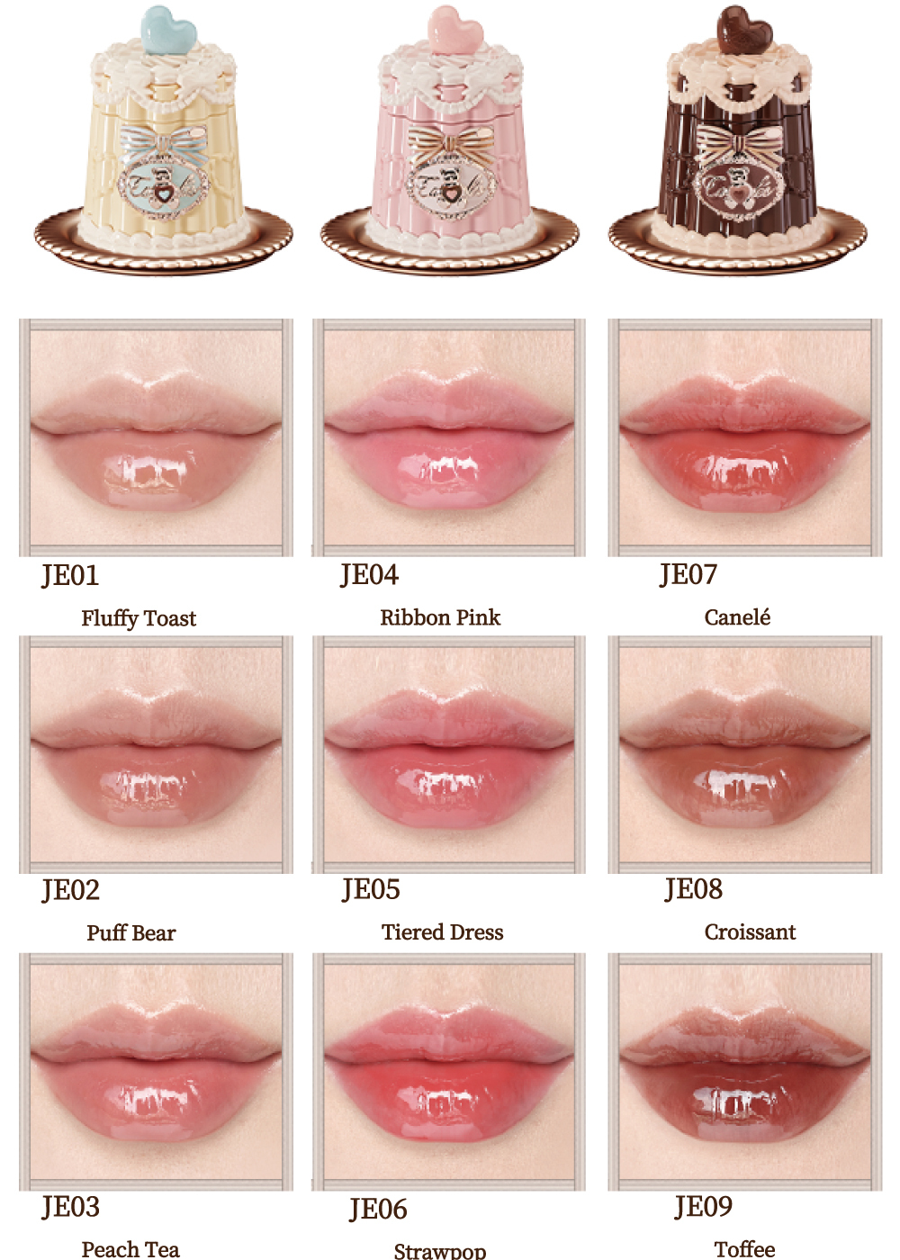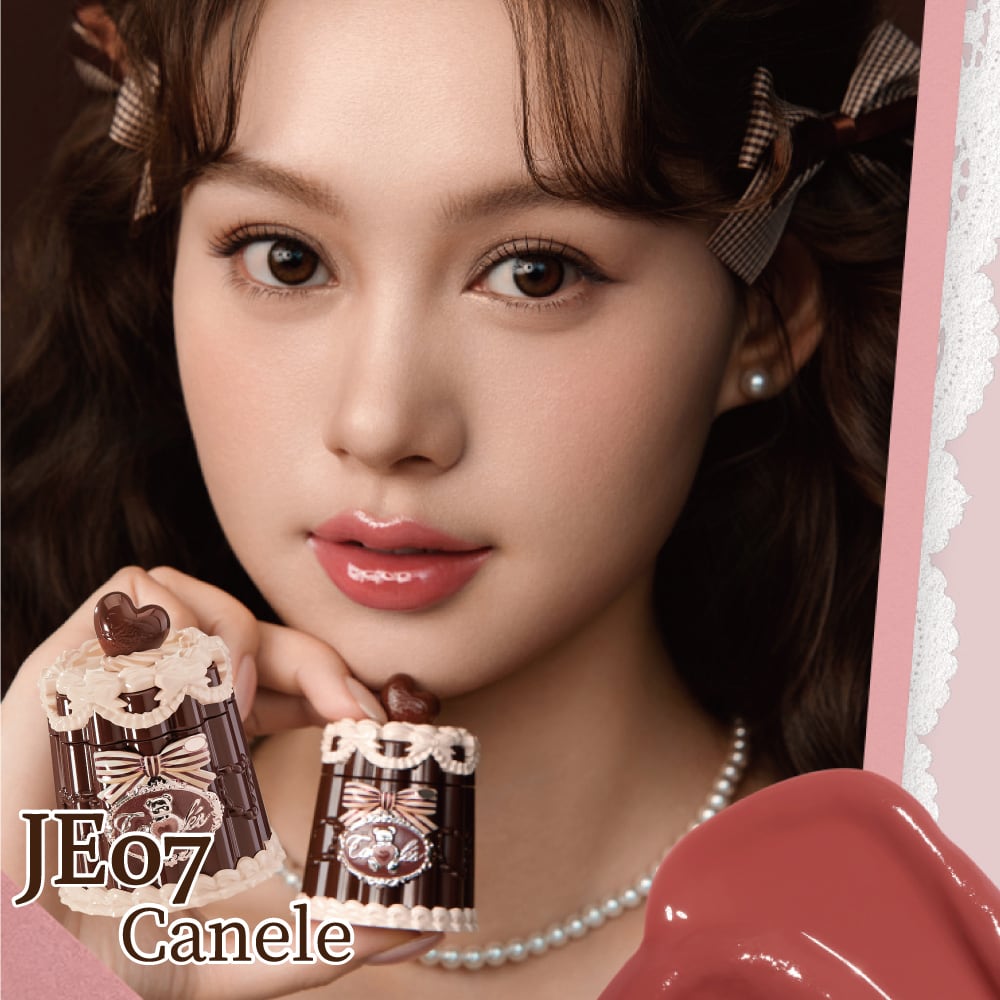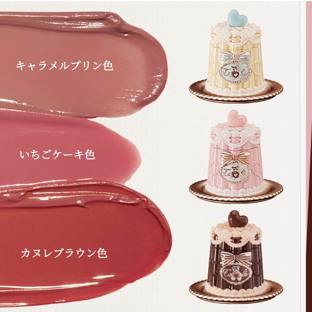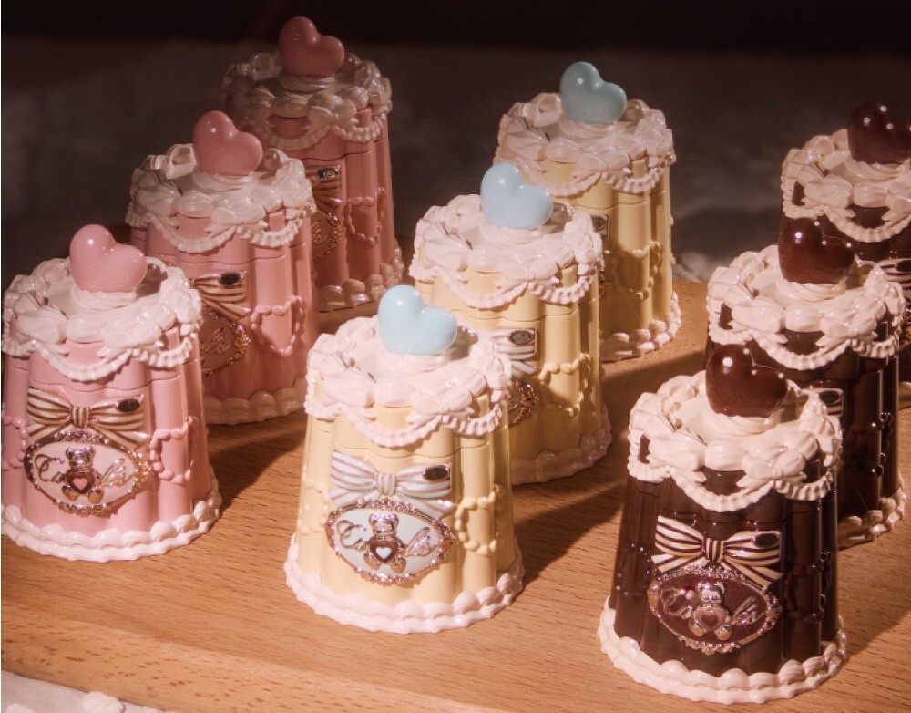 トッピングにはくまやハート、蝶のモチーフを添えて。光の下でつやめく、まるでスイーツみたいな唇に。